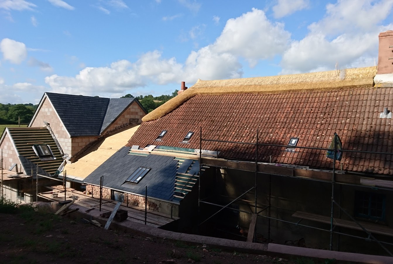 We have been thatching from early till late, these long summer days, working over in the Quantocks on a stone and cob house that is being completely redeveloped. Although there is a deadline that has to be met as some other trades can’t start till we finish, it has been fun to work on a building site again. Usually it’s just me and Daisy on the roof debating this matter or that following whatever has just aired on Radio 4, but with the carpenter’s radio set to ‘Heart’ and plenty of banter between all of us, we’re about 5 weeks adrift of any current affairs. Except the cricket, about which the builder is passionate, so we are more up to date than perhaps we thought we needed to be on that one! There are other differences from working for a private client: Health and Safety is more of a challenge with so many more people on site, and more coming and going on the scaffold, and although part of this means keeping everything tidy, it’s not the same as trying to keep a customer’s garden from the worst ravages of feet, tools and waste reed that seems to weave it’s way through every delicate plant. We can work whatever hours we like with no fear of interrupting a weekend’s peace, although conversely that means we’ve not had a full weekend off for some while. All in all it feels good to be part of a bigger team working to a common goal, and most days have in them much laughter and plenty of tea.