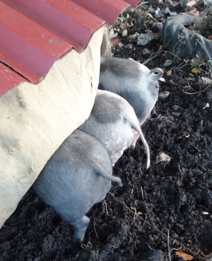 Having scoffed at Daisy for naming her food, I now have to eat my words and introduce to you, Itchy, Scratchy and Sniffles. They might not be huffing and puffing, but my 3 little pigs are doing a good job of bulldozing the bit of ground behind Frank’s Dairy, unearthing all manner of buried scrap and creating neat piles of nettle roots that would have taken me days to pull out. I had forgotten what time wasters pigs can be; they are such characters and together with my youngest son Tom, a day can soon pass. So far he has built them a wallow, and the best of all, his ‘perfect pig massager’; a post driven into the ground with 3 old broom heads bolted to it. Watching each of them heave and scratch against it was the funniest thing and gave Tom’s shins a rest from doing the self same job.