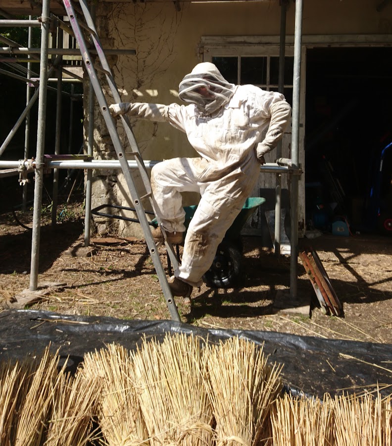 Having all but finished the water reed re-thatch in Rawridge (just the porch to do now that the scaffold is down) we are now out at Tatworth re-thatching a lovely little cider barn in wheat reed. Not quite so lovely are the Tree Bumblebees nesting in either end of the old thatch, mad as hell that I’ve disturbed them and landing several good stings. Luckily another customer who lives nearby, is a bee keeper, so on the hottest two days of the year so far I could be found looking a lot like Buzz Lightyear, in a heavy white canvas suit with mesh visor. Filled with new confidence I was back on the roof, but the bees kept coming with a tick tick tick as they each hit the visor. Pretty disconcerting for all I was protected, if melting inside the suit. I was later told that you’ve got to calm your breathing, and this, together with the fastest bit of thatching on those ends that I could manage with reduced vision and heavily gloved hands did seem to calm me and the bees down a bit. I’m all for saving the wildlife, but that was all a bit much!